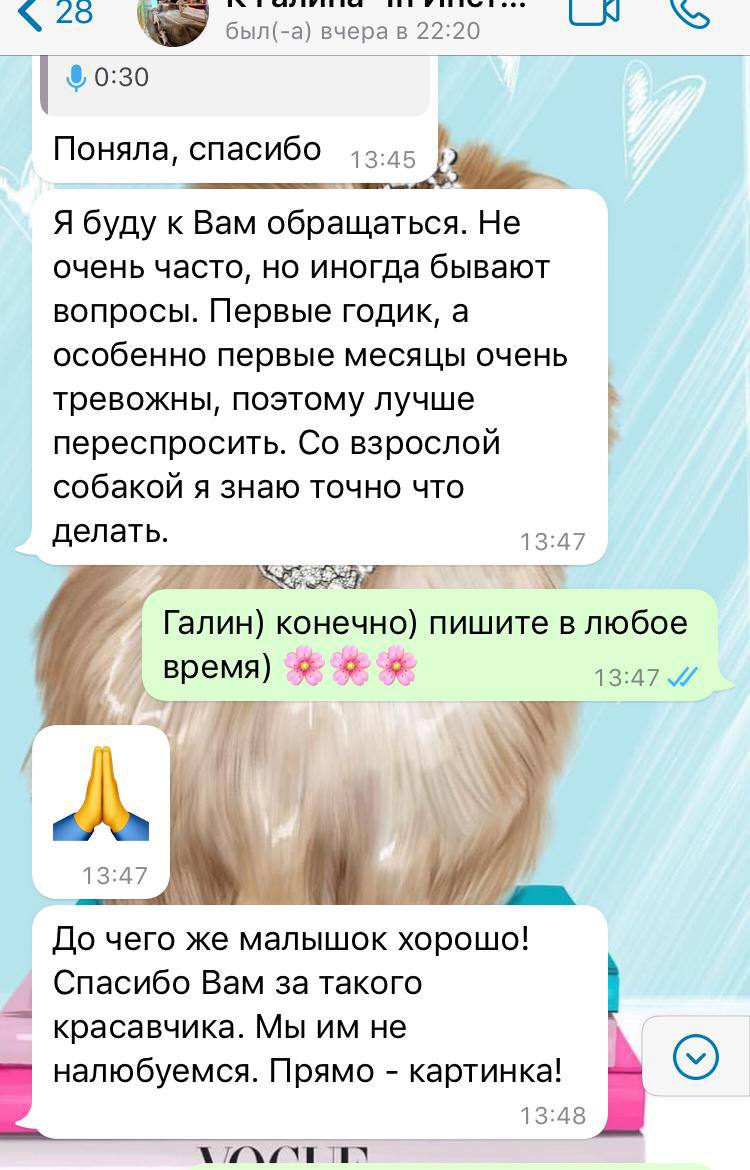 Leave a phone number and we will send a photo of the puppy you need, help with the choice and advice!