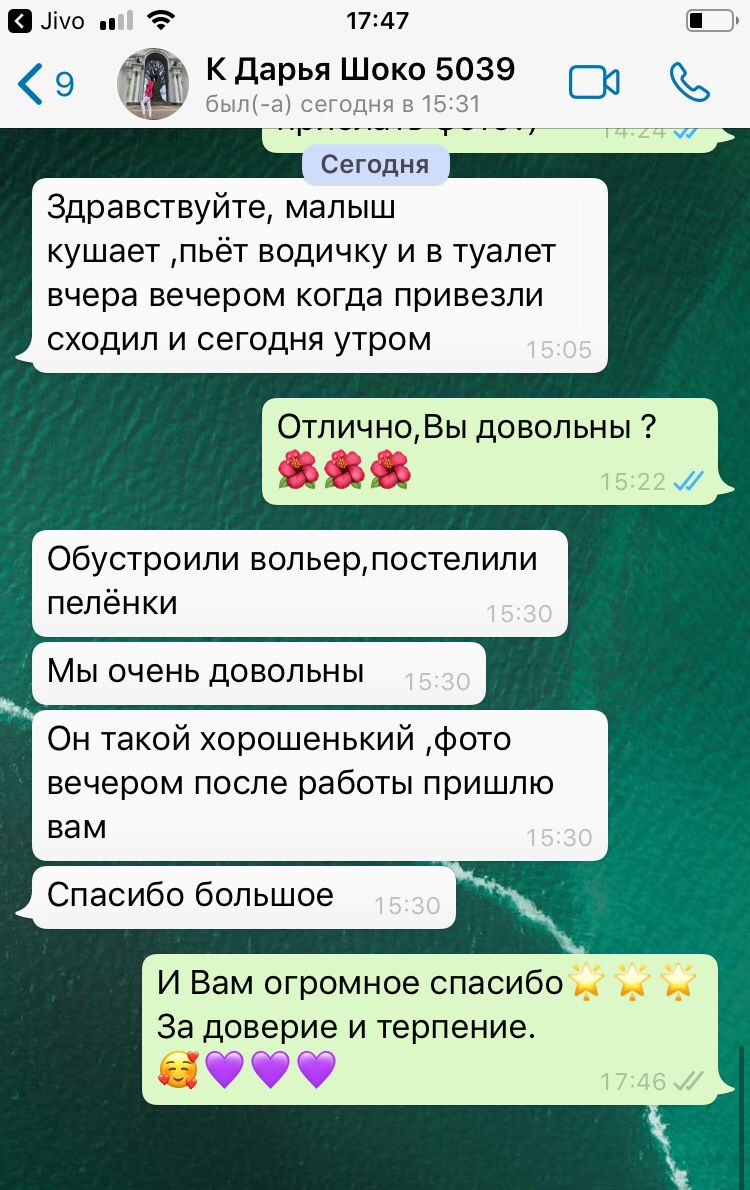 The cost of delivery depends on the distance to your location. We will organise a special seat for your pet in the cabin. Your little one will fly in comfort and without stress. Our personal courier will bring him to you and put your puppy in your hands!